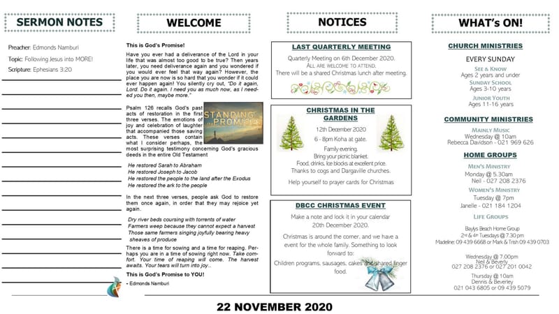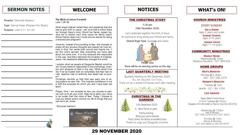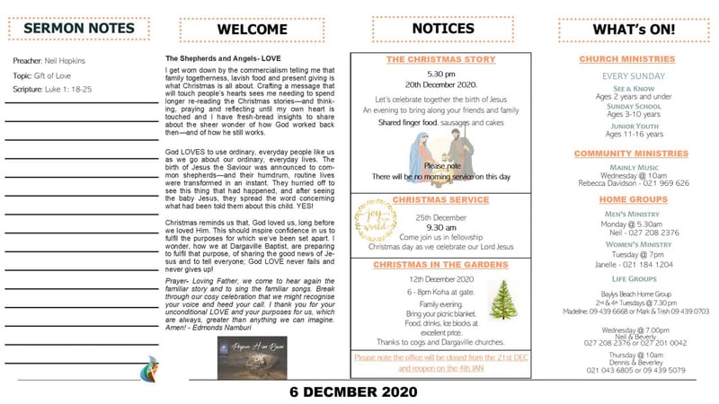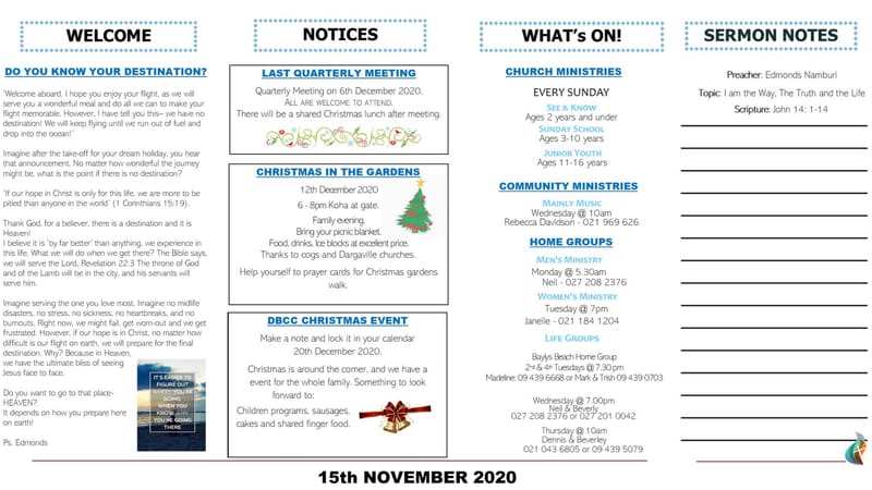 This includes our 10:30am Sunday Service at 185-187 Victoria Street, Dargaville, where we gather together before God. Please join us.